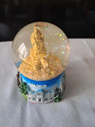 Bola de nieve conmemorativa de Madrid. Contiene una figura en su interior y purpurina. - Base con el nombre Madrid. - Representación de un edificio emblemático de la ciudad.