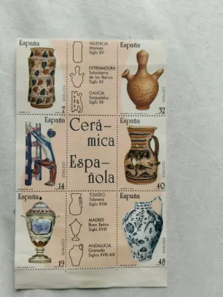 Conjunto de sellos postales de España con temática de cerámica española. - Sello de Valencia, Manises, Siglo XV. - Sello de Extremadura, Salvatierra de los Barros, Siglo XX. - Sello de Galicia, Sargadelos, Siglo XX. - Sello de Toledo, Talavera, Siglo XVIII. - Sello de Madrid, Buen Retiro, Siglo XVIII. - Sello de Andalucía, Granada, Siglos XVIII-XIX.