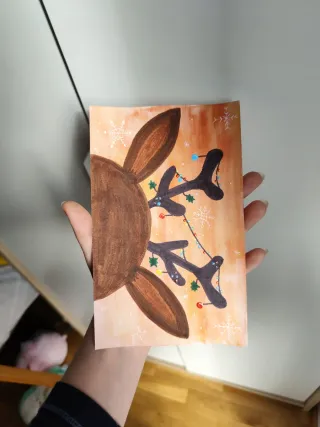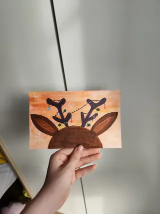 Postal navideña con un diseño de reno. - Cabeza de reno con astas. - Decorado con luces de colores. - Incluye adornos y copos de nieve.