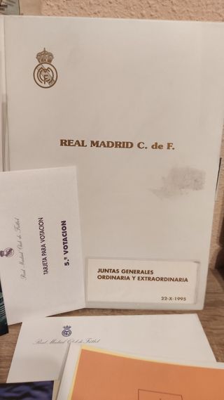 Carpeta Junta General Ordinaria y Extraordinaria con el orden del día 1995. Tarjetas de votaciones con sobres. Libro Memoria Real Madrid Club de Fútbol 1994-1995. Postal antigua Santiago Bernabéu. Cuadernillo de hojas Real Madrid.