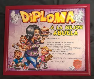 Diploma de reconocimiento para la mejor abuela. Un detalle emotivo y divertido. Dos unidades iguales disponibles. Precio por unidad 5€. Los dos juntos 8€. - Diseño con ilustración de abuela, nietos y pastel. - Mensaje de agradecimiento y cariño. - Espacio para nombre y fecha.