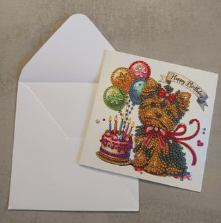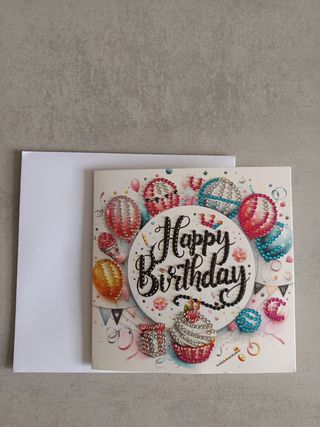 Vendo tarjeta de felicitación de cumpleaños con diseño de globos y regalos, muy original, hecho a mano, de pintura de diamantes. Incluye sobre blanco.