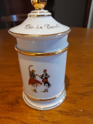 Bonito tarro de recuerdo de Teruel, decorado con una escena de baile tradicional. - Diseño con figuras bailando. - Inscripción Rdo. de Teruel. - Detalles dorados en tapa y base.