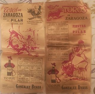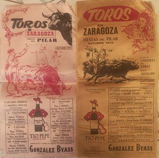 Conjunto de 13 carteles antiguos de seda de las Fiestas del Pilar de Zaragoza. Presentan diseños taurinos y detalles de las corridas. - Material: Seda. - Temática: Toros y Fiestas del Pilar. - Año: 50 ,60 y 70 - Ilustraciones de toros y toreros.