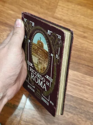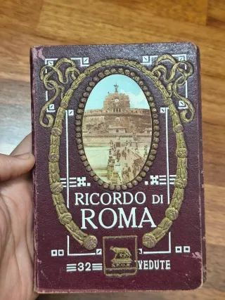 Libro de postales antiguas de Roma, con vistas de la ciudad. - Portada con imagen del Castel Sant'Angelo. - Título Ricordo di Roma y Vedute. - Incluye el emblema de la Loba Capitolina.