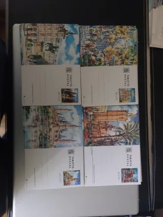 Lote de 8 tarjetas postales de España. Cada una muestra una ilustración diferente. - Tarjetas postales con imágenes de monumentos y paisajes españoles. - Incluyen sello y texto TARJETA POSTAL y ESPAÑA. - Números de referencia visibles en algunas tarjetas: 0611042, 0611032, 0963277, 0076985.