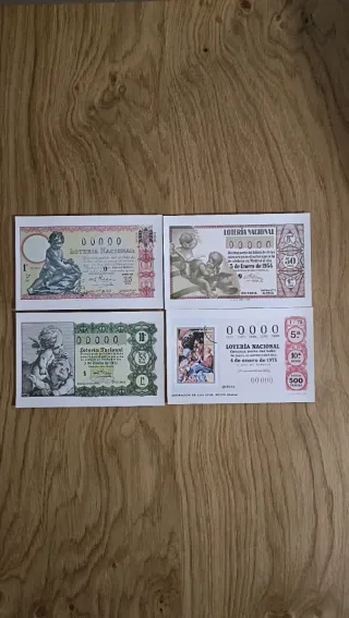 Conjunto de cuatro postales representando Decimos antiguos de Lotería Nacional. - Decimos con diseños clásicos. - Incluyen fechas de sorteos de 1941, 1954, 1957 y 1975 - Cada decimo tiene un valor nominal diferente (15, 50, 500 pesetas). En perfecto estado de conservación. Ideal coleccionistas. En Zaragoza, recoger en zona Delicias.