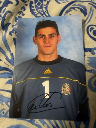 Postal de Iker Casillas con su firma. Se firma en 2004 en Zaragoza en un evento de firmas de los jugadores para el amistoso España-Grecia. La firma la realiza sobre la postal cada jugador. En la postal hay un agujero del tamaño de una chincheta ya que estuvo colgada