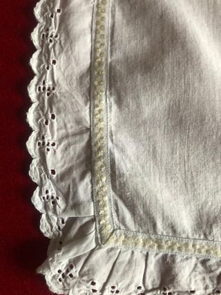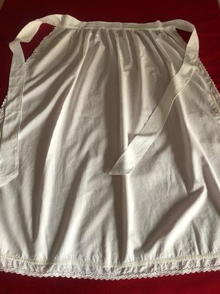 Delantal o mandil antiguo de tela blanca de algodón, con detalles de tira bordada - Ribete de tira bordada en el borde inferior. - Lazos para atar en la cintura. - Mide de largo 93 cm y de ancho 85 cm. De cintura 50 cm + lazos. - Bien conservado Se envía por Wallapop