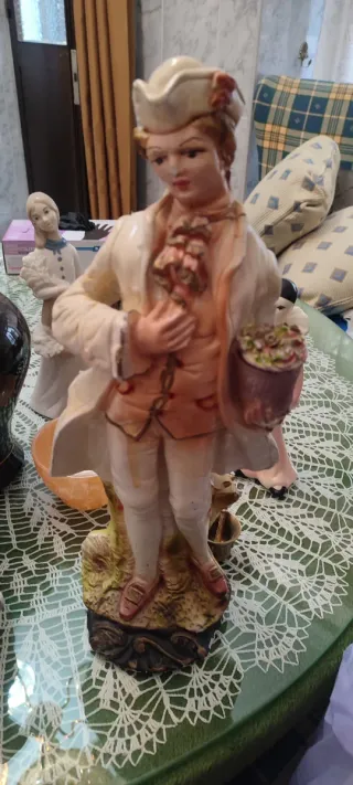 Precio individual Conjunto de figuritas antiguas de porcelana con un diseño clásico. - Figura masculina con traje de época y sombrero. - Figura femenina con vestido y ramo de flores. - Base detallada con elementos naturales.