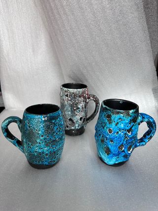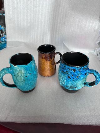 Conjunto de tres jarras de cerámica de estilo francés antiguo. Cada pieza presenta un diseño único y artesanal. - Cerámica con acabado texturizado. - Tonos azules y cobrizos. - Interior negro brillante. - Miden 2 jarras 13 cm y la amarilla 12 de altas Se envia por Wallapop