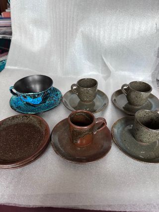 Conjunto de tazas de cerámica con sus platillos. - Diseño artesanal con acabados rústicos. - Colores variados, incluyendo tonos tierra y azul vibrante. - Piezas únicas con un estilo vintage.