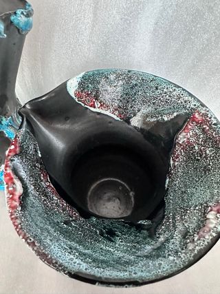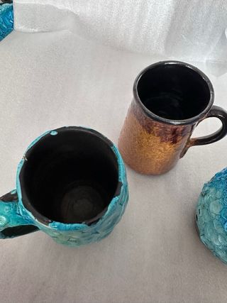 Conjunto de cerámica artesanal de origen francés, que incluye tres copas y un cuenco. - Diseño único con acabados texturizados. - Colores vibrantes y detalles llamativos. - Piezas decorativas y funcionales.