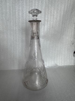Botella de cristal muy antigua con un diseño labrado y decorativo. - Material: Cristal. - Diseño: Labrado con motivos vegetales y un círculo central. - Tapón: Incluye tapón de cristal facetado. - Tiene una inscripción “Hilario Botella” “Jativa” Mide de alta con la tapa 29 cm. Se envia por Wallapop