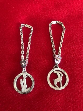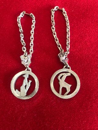 Conjunto de dos llaveros de plata de ley con diseños de horóscopos, Capricornio y Acuario. Miden de anchos 2,3 cm, de largos 9 cm y abiertos 16 cms. Nuevos, sin usar. Se envia por Wallapop