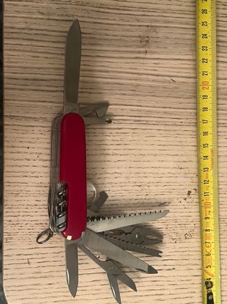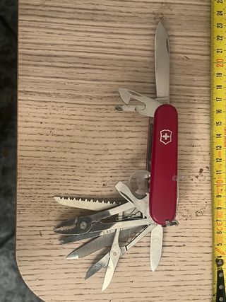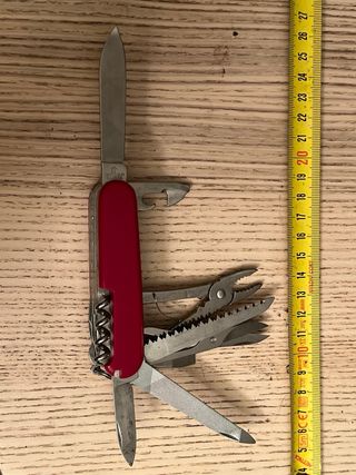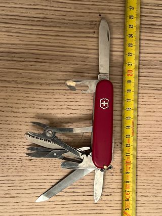 Navaja multiusos clásica de la marca Victorinox en color rojo. Tiene la ounta de la hoja algo torcida mirar fotos - Hoja principal de acero inoxidable. - Abrelatas y destornillador. - Tijeras y lima. - Alicates pequeños.