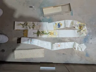 Estola litúrgica de tela blanca con bordados y flecos. - Diseño floral con detalles dorados. - Motivos religiosos y escenas representadas. - Flecos en los extremos.
