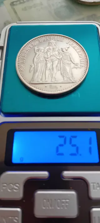 Moneda francesa de plata 900. 50 Franco mil novecientos setenta y seis 1976 , treinta y uno con uno muy buenas condiciones actas para coleccionistas y neumáticos una moneda preciosa - Diseño con figuras alegóricas. - Inscripción Liberté, Égalité, Fraternité.