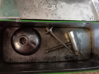 Caja metálica vintage, ideal para máquinas de coser antiguas. - Diseño rectangular. - Color verde. - Grabado de logo circular con texto 'SIGMA'.