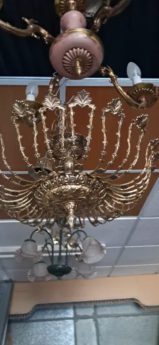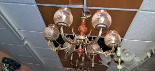 Elegantes lámparas antiguas de araña con un diseño clásico. - Estructura dorada con detalles ornamentales. - Tulipas de cristal tintado con motivos florales. - Elementos decorativos en madera y cerámica.