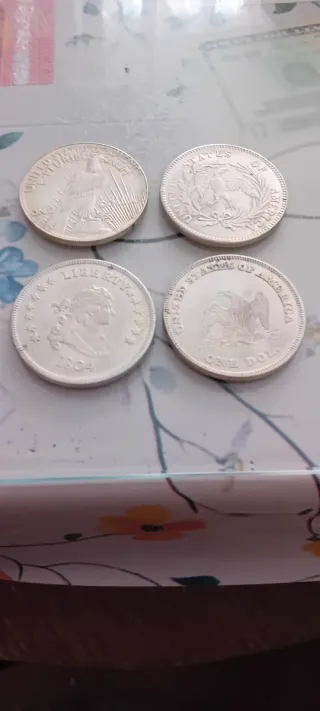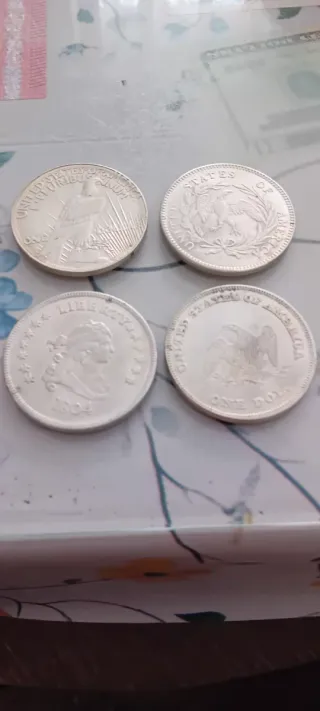 Conjunto de cuatro monedas de de Estados Unidos. Moneda muy bonita monedas grandes y coleccionables y hasta para numismáticos estas monedas las compré yo en el mercadillo de antigüedades - Moneda con águila. - Moneda con perfil de mujer y año 1804. - Moneda con águila y ONE DOLLAR. - Moneda con águila y UNITED STATES OF AMERICA.