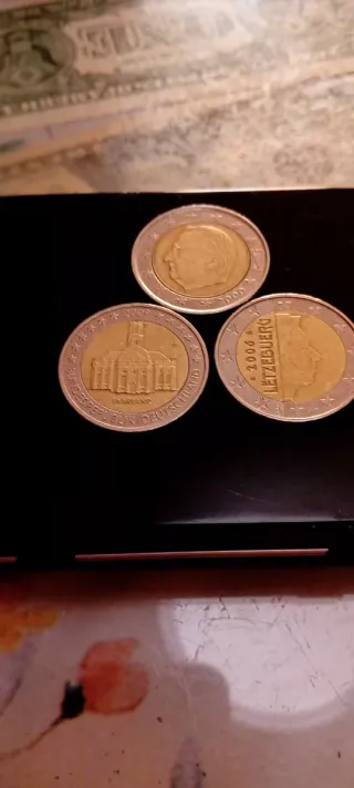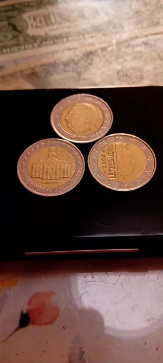 Conjunto de tres monedas de dos euros. - Una moneda con retrato. - Una moneda con edificio. - Una moneda con mapa.