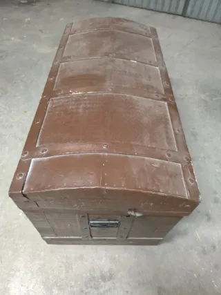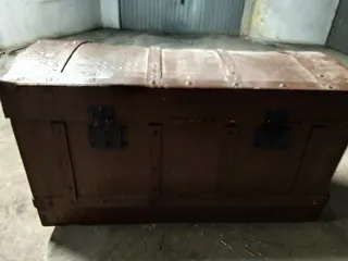 Arca antigua con un diseño clásico y robusto. Ideal para decoración o almacenamiento. - Material: Madera. - Color: Marrón. - Detalles metálicos en los bordes y cierres.