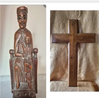 Conjunto de dos piezas de madera: una figura de la Virgen de Nuria y una cruz. - Figura de la Virgen de Nuria tallada en madera. - Cruz de madera....