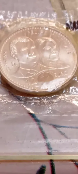 Moneda conmemorativa de 12 euros. En su plástico desde el primer día que salió del banco nueva a estrenar De la boda del rey Juan Carlos y Letizia - Fabricada en plata de ley. - Presenta un diseño con dos perfiles. - Año 2012.