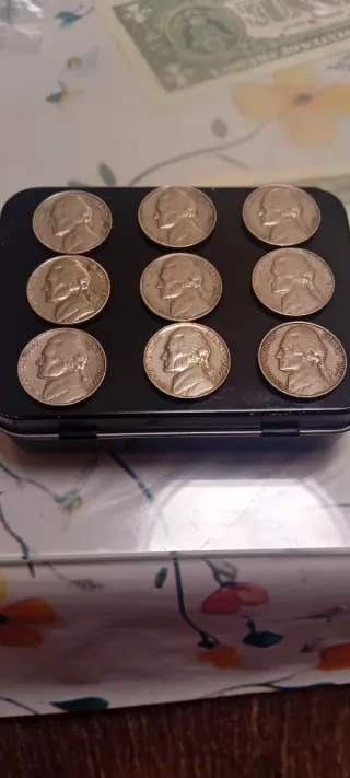 Moneda estadounidense de 1964. El muy buen estado monedas hasta para numismáticos y coleccionistas siete monedas de 1964 una moneda de 1970 y otra moneda de mil novecientos sesenta y siete en total son nueve monedas - Diseño de Thomas Jefferson en el anverso. - Montaña y Monticello en el reverso.