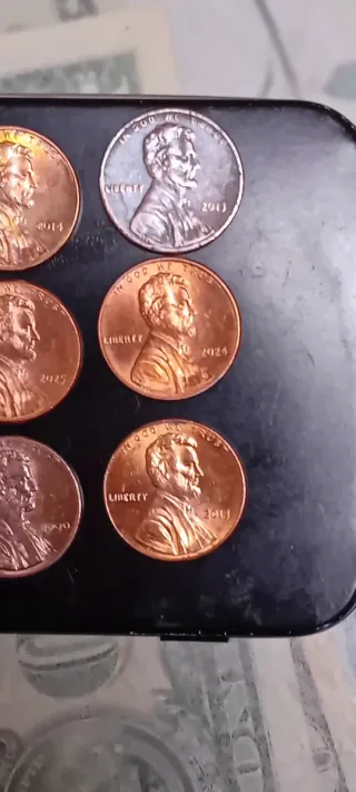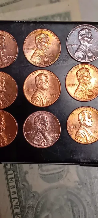 Conjunto de monedas de centavo con la efigie de Abraham Lincoln. Cada moneda presenta un diseño detallado y el año de acuñación. - Moneda de 2003 - Moneda de 2012 - Moneda de 2014 - Moneda de 2025 - Moneda de 1999