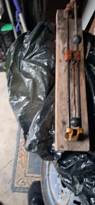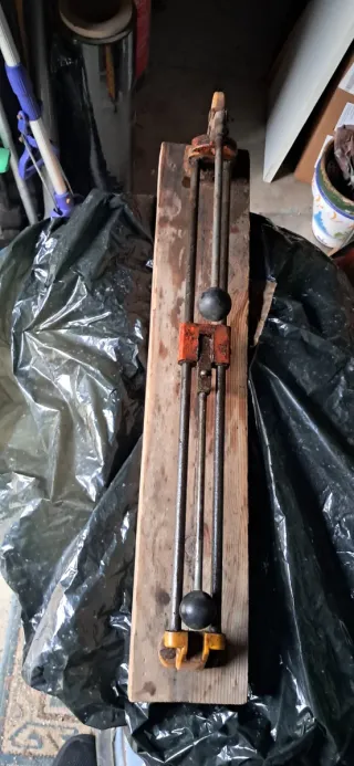 Objeto decorativo o funcional de madera y metal con un diseño antiguo. - Base de madera. - Varillas metálicas. - Bolas decorativas.