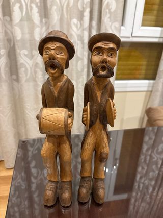 Conjunto de dos figuras de madera tallada a mano, representando a músicos. - Figura 1: Músico con sombrero y tambor. - Figura 2: Músico con gorra y platillos.- El precio es por unidad - Miden 37 cm de alto