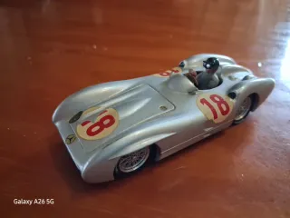 Réplica detallada del icónico coche de carreras Mercedes W196, pilotado por Juan Manuel Fangio. Fabricado por Brumm. - Diseño plateado clásico. - Detalles de época con el número 18. - Figura del piloto incluida.