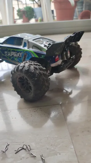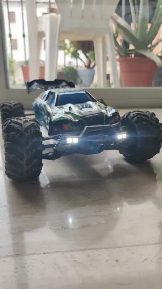 Coche teledirigido con un diseño deportivo y ruedas todoterreno. - Carrocería con detalles en verde y azul. - Luces delanteras encendidas. - 2 baterías una de ellas nueva - lo compré por capricho pero no lo uso, velocidad máxima 70km/h