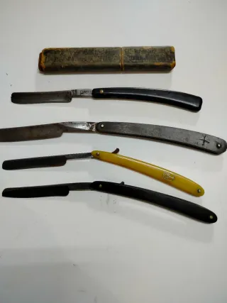Lote de cuatro navajas antiguas de barbería, un estuche, y maquinilla con funda de piel. Se envía por walapop