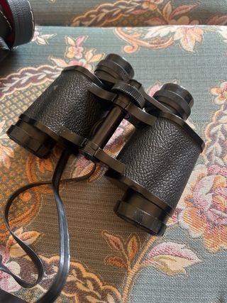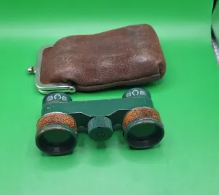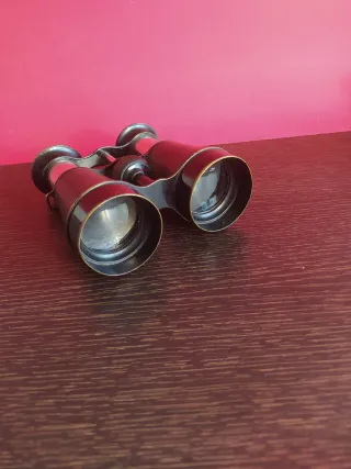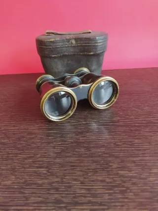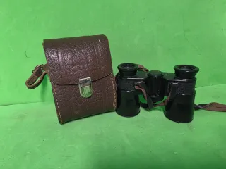 Prismáticos antiguos de época, completos con su funda original rígida y correa. El interior de la funda está forrado en terciopelo rojo. Los prismáticos funcionan correctamente, el sistema de enfoque es operativo y permiten una visión clara acorde a su antigüedad. Conservan las tapas originales. Una de las tapas presenta una pieza del soporte rota, por lo que no se fija correctamente, tal y como se aprecia en las fotografías. Este defecto no afecta al uso ni al funcionamiento, únicamente es estético. La funda muestra desgaste visible por el paso del tiempo, especialmente en el interior y la base, pero cierra bien y protege el conten