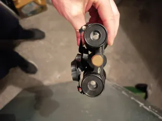 Conjunto de artículos militares antiguos, que incluye unos prismáticos y una mira. - Prismáticos de estilo clásico. - Mira militar de color verde oliva.