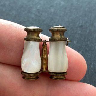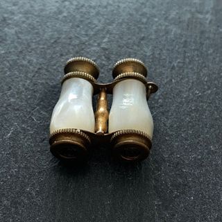Fabricados en latón con ribete de nácar natural. Accesorio para muñecas: Los binoculares en miniatura se usaban para complementar la indumentaria de las muñecas francesas de colección de la época. Presentaban una pequeña anilla en el cuerpo y solían usarse como colgante en una cadena o como llavero para un reloj de bolsillo.