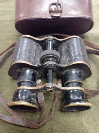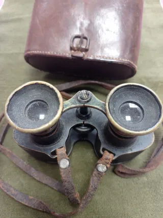 Prismáticos o binoculares de trinchera ww1 guerra civil brigadistas. - Funcionan correctamente. - Cuerpo de los prismáticos en negro y metal. - Correa de cuero. - Funda de cuero marrón con cierre metálico. - Recreación Histórica Militares Ejercito República