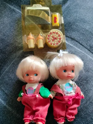 Set de dos muñecos Mellizos Chabel. - Incluye accesorios como biberones, tarta y otros complementos.nuevo. - Los muñecos llevan puestos monos rojos y camisetas. Los muñecos presentan algún brazo y pierna mal(se les cae)no están en perfecto estado y la ropa de melli necesita costura por detrás.