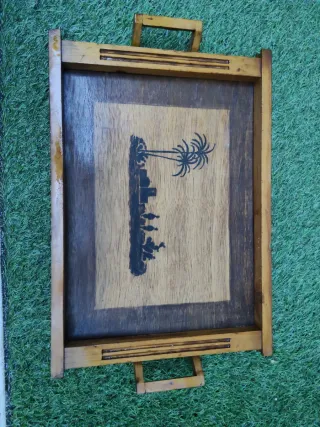 Bandeja de madera con un diseño decorativo en el centro. - Material: Madera. - Diseño: Paisaje con palmeras y figuras. - Asas laterales para facilitar su transporte.