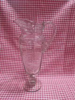 Elegante jarra de cristal con un diseño clásico y un pie decorativo. Perfecta para servir bebidas con un toque vintage. - Material: Cristal. - Diseño: Tallado. - Base: Redonda y estable.