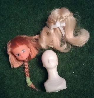 Lote de cabeza de muñeca Chabel con dos pelucas. -Cabeza Chabel corta y peina. - Una cabeza de muñeca con pelo castaño y trenza. - Una peluca rubia rizada con lazo blanco. - Maniquí para peluca