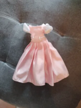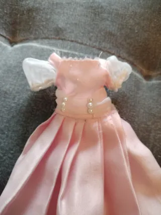 Vestido rosa para muñeca Chabel, inspirado en Cenicienta. Confeccionado en tela satinada. - Mangas abullonadas con detalle de encaje. - Cinturón decorado con perlas. - Falda amplia con pliegues. No está en perfecto estado velcro no pega bien