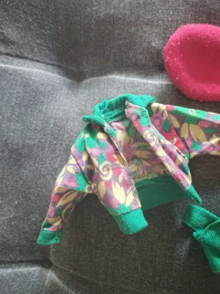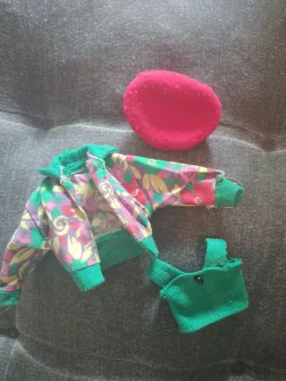 Conjunto de ropa para muñeca Chabel Difussion. - Chaqueta con estampado floral. - Top verde el velcro no pega - Boina roja.