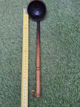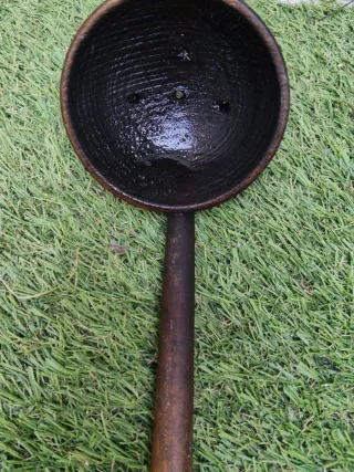 Cuchara antigua con un diseño rústico y funcional. - Material: Madera. - Presenta agujeros en la parte cóncava.