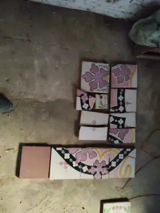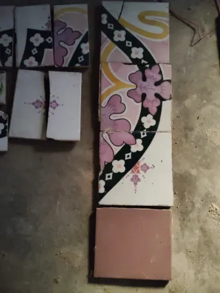 Conjunto de retales de chapado valenciano antiguo con diseño floral. - Piezas con motivos florales en tonos rosas y amarillos. - Borde decorativo en negro y blanco. - Un retal liso en tono rosado.