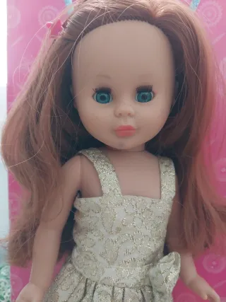 Muñeca Kika con el pelo pelirrojo y ojos azules. - Vestido dorado con detalles. - Lazo decorativo en la cintura. - Incluye accesorios de ropa verde con lunares blancos.