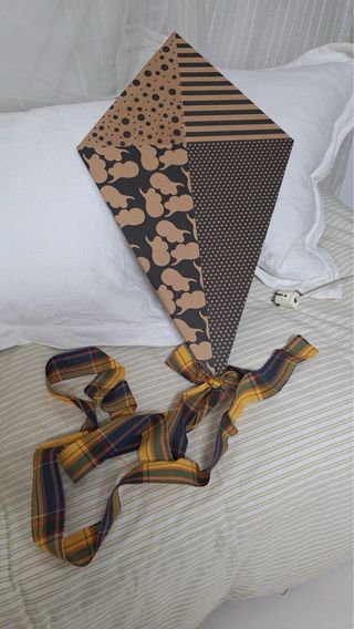 Conjunto de tres cometas decorativas hechas con papel pintado sobre cartón pluma. Cada cometa presenta un diseño único. - Cometa con diseño de lunares. - Cometa con rayas diagonales. - Cometa con diseño de bloques de color. Medidas 75cmx45cm